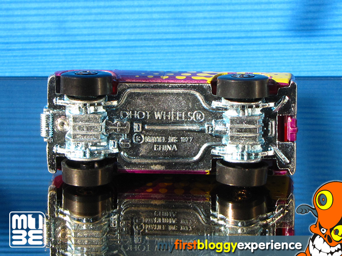 La primera muestra es parte de las líneas Regulares e irónicamente la tarjeta reclama que tiene "apertura de capó" (Hot Wheels tiene un extraño sentido del sarcasmo, pero yo soy mejor en eso =PPPPP); tiene carrocería y chasis en diecast, este último tiene un ligero matiz azulado que luce muy bonito; el trabajo de pintura en lila oscuro con acabado Metalflake y un patrón con puntos amarillos tiene un toque vintage que se ajusta perfectamente a este modelo; las ventanas son transparentes, con interiores trabajados en rojo; las ruedas plásticas presentan un diseño de rimes muy inusual Large Black Wall Basic Wheel en cromado y fue hecha en China.