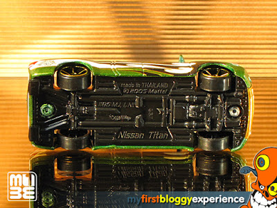 Los trabajos de pintura fueron hechos en azul con acabado Metalflake, plateado y verde aguacate con acabado perlado / Metalflake; en el caso de las decoraciones, la que menos me gusta es la creada para la Silverado, con tampos blanco y negro, para la primera Titan no fue un diseño estupendo pero no es feo tampoco, con tampos en verde limón, azul claro y negro, finalmente la ganadora de lejos para mí es la decoración hecha para la última Titan, con tampos en blanco, dorado y negro, sobre prácticmante todos los paneles de la carrocería, excepto el techo (añadí pintura plateada para las luces frontales), es algo que me encantaría ver en una camioneta pickup real y sí, ese fue un cumplido sincero a los diseñadores en Hot Wheels, combina maravillosamente con el dorado cromado del chasis!...